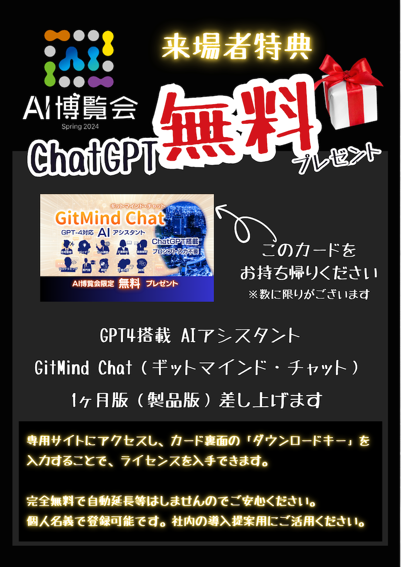 また、当社ブースへの来場者特典として、先着300名にGPT-4対応のAIアシスタント「GitMind Chat」製品ライセンス1ヶ月分を無料プレゼントします。