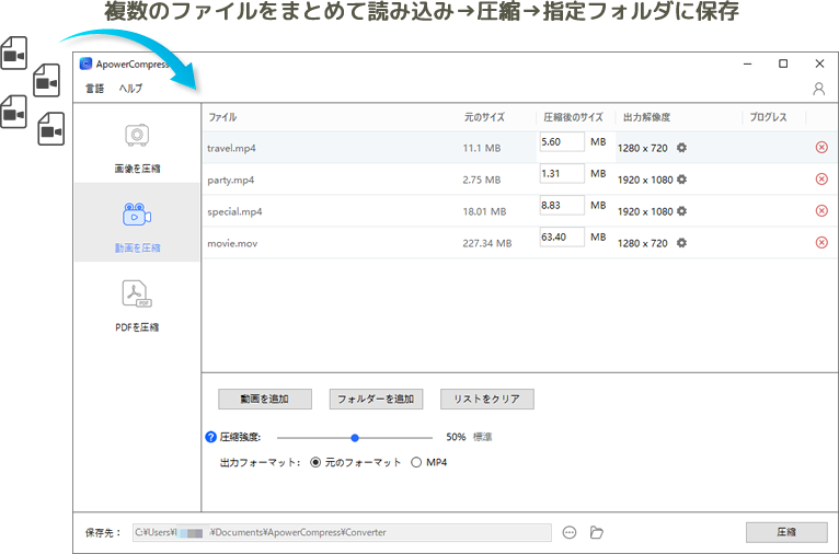 動画は希望サイズを指定して圧縮