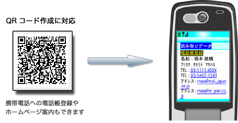 QRコードとは、名前/電話番号/e-mailアドレス、ホームページアドレスなどの情報を持つことができる二次元バーコードで、QRコード読み取り機能の付いた携帯端末で読み取ることが出来ます。