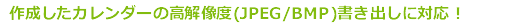 作成したカレンダーデザインを、他の印刷ソフトや画像編集ソフトで開きたいというニーズにお応えし、JPEG/BMPの高解像度画像書き出し(最大360dpi)に対応しました。