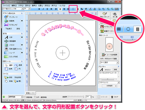 ワンクリックするだけで、文字をディスクに沿って円形にできる「文字の円形配置ボタン」を搭載!