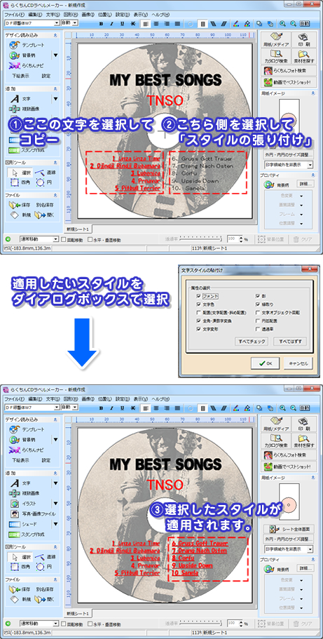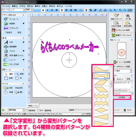 オブジェクトを円周に沿って配置をしたり、テキストを円弧状に変形したりなどCDに特化したデザインも自由自在です。 「らくちんCDラベルメーカー15」では、更に操作しやすくなりました!