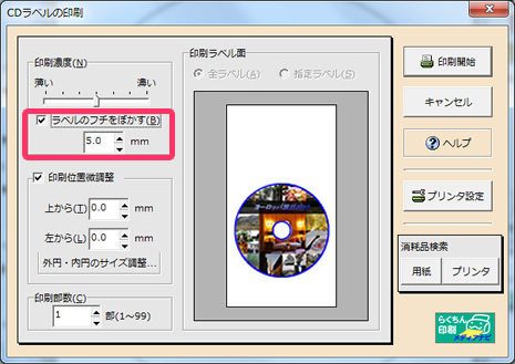 ディスクの外円/内円ギリギリ(120mm〜15mm)まで調節可能し、印刷すること