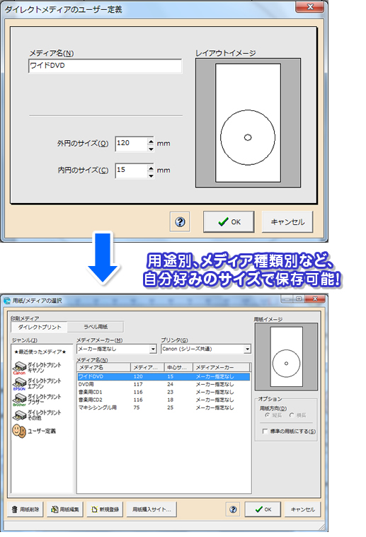 ・ダイレクトプリントのメディアサイズをお好みに変更して保存できます。