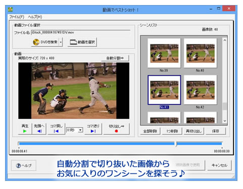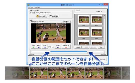 動画を「ここから~ここまで」と範囲を指定し、範囲内から自動分割して画像を抜き出すことができます。