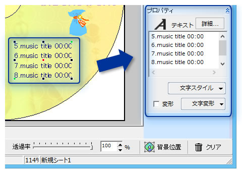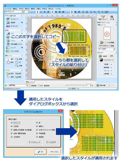 らくちんCDラベルメーカー17 では、ワンクリックでカッコいいタイトル文字を作成することが可能です。文字を入れて、プルダウンから「スタイル」を選ぶだけでタイトル文字の出来上がり。