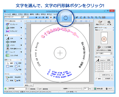 ワンクリックするだけで、文字をディスクに沿って円形にできる「文字の円形配置ボタン」を搭載 !