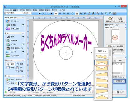 オブジェクトを円周に沿って配置をしたり、テキストを円弧状に変形したりなどCDに特化したデザインも自由自在です。