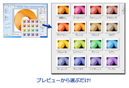 プレビュー一覧から選ぶだけの簡単操作で、多数の色展開を楽しむことができます。