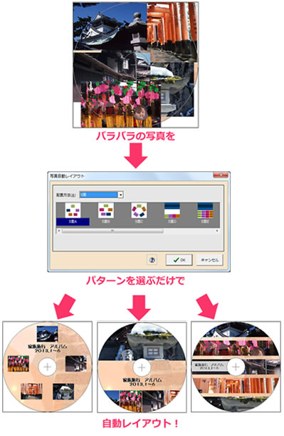 使いたい写真を編集画面に貼り付けて「写真自動レイアウト」を起動すると、お勧めレイアウトパターンの選択画面が表示。