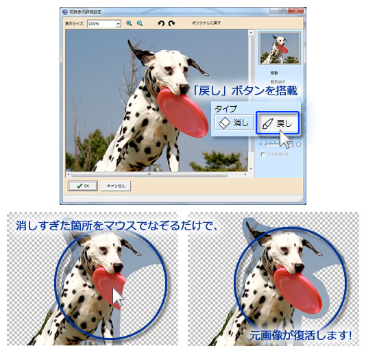 背景柄の切り抜き機能を使えば、マウス操作や0.1mm単位の詳細な指定方法で写真を切り抜くことができます。