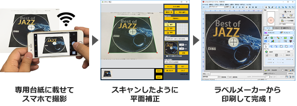 スマートフォンのカメラで撮影して、Wi-Fi経由で自動転送。「スキャン・補正」画面で平面補正設定が完了したら、ラベルメーカーに貼り付けられます。あとは印刷して完成!