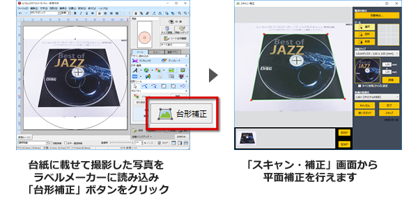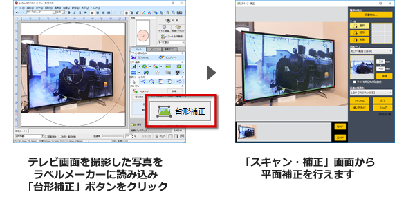 デジタルカメラで撮影した画像でもOK!ラベルメーカーに写真を読み込んで「台形補正」ボタンから「スキャン・補正」画面を呼び出して平面補正を行えます。