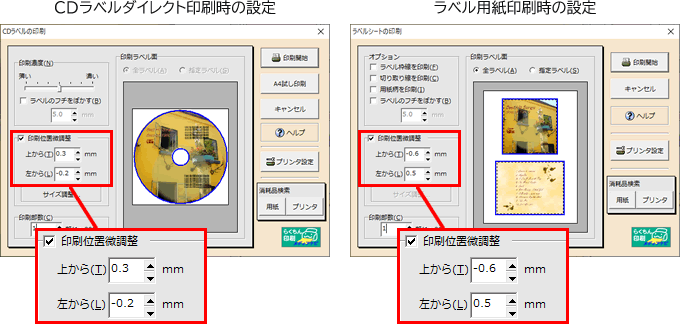印刷位置はプリンタによって若干の誤差が生じる場合があります。正しい用紙・サイズを設定しても、印刷してみるとズレが生じてしまう場合には、印刷位置を0.1mm単位で調節することができます。