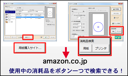 使用中の用紙やインクの情報をオンライン(Amazon.co.jp)から検索することが出来ます。