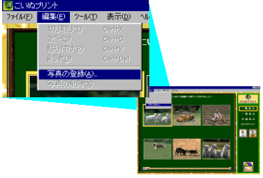| 実は、「こねこプリント」「こいぬプリント」では、新たに写真を追加することも出来るのです。 写真の一覧画面で写真を登録する事ができますので、ここで自分の好きなペットなどの写真を登録しましょう。 メニューバーの【編集(E)】-【写真の登録(A)】を選択します。 デジタルカメラやスキャナーで取り込んだ写真ファイル(BMP/PCD)をアルバムに登録できます。 |