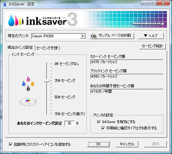 インクカートリッジの値段を設定しておけば、“年間でどれくらいのインクコストを削減できるか”を予想を計算することができます。更に「セービング統計」の機能では、「inksaver3」を使用した印刷履歴を元に統計をとり、「inksaver3」を使用しなかった場合と比較してどれくらいの節約効果があったかを確認できます。
