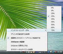 - インクのセーブは0~75%まで調整可能です。タスクバーに常駐するアイコンをクリックし簡単に濃さを調節できます(いつでも調整可能)。