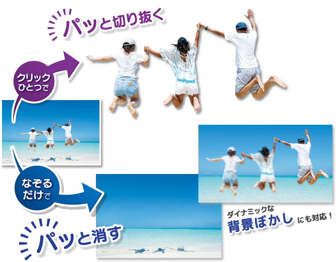 なぞるだけで写りこんだ人物などを切り取って消したり、一眼レフで撮ったような背景をぼかして被写体にフォーカスを当てたりといった加工をどなたでも簡単手軽に行うことができる画像編集ソフトです。