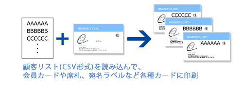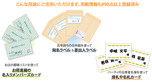 お手持ちの顧客リストを使って名入りの会員証や診察券、席札を作成できます。またDM用の宛名シールを作ったり、カード内にクーポン番号を流し込んで印刷したりと工夫次第でいろいろな場面で役に立ちます。