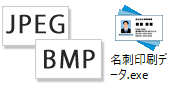 名刺データを印刷専用形式ファイル(exe)で出力できます。ソフトが入っていないパソコンで起動でき、名刺印刷が可能です。 データを持ち歩くことができるので、名刺を切らしてしまった時など出先でも重宝します。 またソフトを持たない社員が自分で印刷をすることも可能です。 そのほか、高解像度画像のJPEG/BMP形式の画像出力にも対応しています。