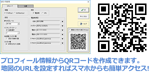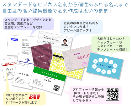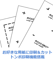 プロフィールDBと連動したQRコード埋め込みや、文字や図形を組み合わせたロゴマークの作成に対応。裁断機でカットするのに便利なトンボの印刷機能も搭載しています。