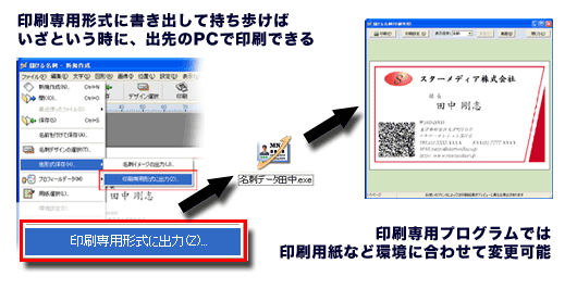 出張先やパーティ−会場で、うっかり名刺を切らせて恥ずかしい思いをしたことはありませんか?ネットに保管 、メモリに保管、会社でも出先でも自宅でも自由に印刷できるのがこれからの常識。『儲ける!名刺』なら、アプリケーションをインストールしていない環境でも、名刺データをインターネット上に保管したり、メモリカードなどに入れて持ち歩き、出先のホテルや出力センターなどのパソコンで、即座に好きな枚数だけ名刺の印刷が出来ます。