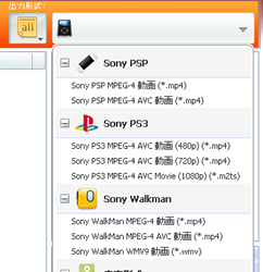 PSP、PS3、WALKMAN などのデバイス名、動画ファイル/音声ファイル形式を選ぶだけ。