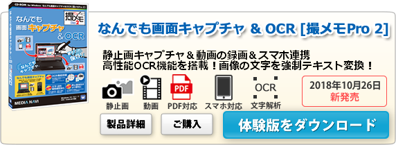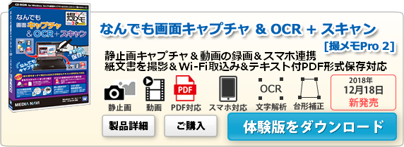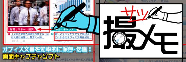 「撮って、書き込んで、送る!」、新しい画面キャプチャ&管理ソフトです。 PCの画面をサクサク撮影し、文字や図形を書き込んで、メールやファイル共有、オフィスソフトに貼り付けることができます。しかも操作は簡単! さらにパソコン画面を撮影・録画するだけじゃない!!紙の書類をデジタルデータ化して活用するための機能が続々追加! オフィス文書、マニュアルやプレゼン資料作成など、様々なシーンで大活躍!