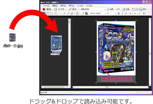 撮影したスクリーンショットや、お手持ちの画像ファイルを編集画面上に貼り付けることができます。