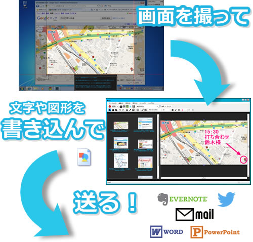 PCの画面をサクサク撮影し、文字や図形を書き込んで、メール送信やオフィスソフトに貼り付けることができます。しかも操作は簡単!