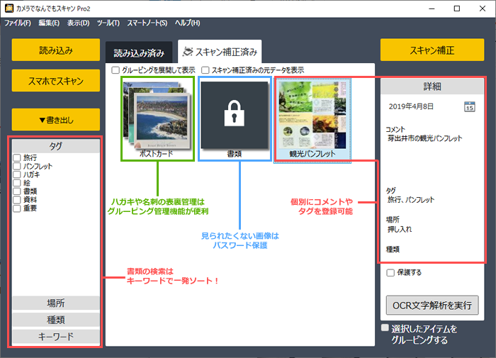 さらにタグやキーワードで必要な書類をさっと呼び出したり、書類の裏表などのグルーピング管理、機密文書のパスワード保護機能など、充実した管理機能も搭載されています。