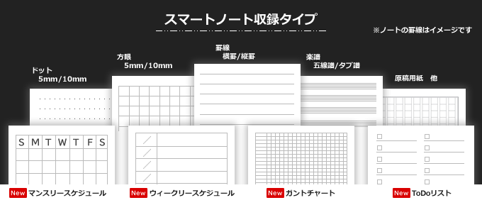 一般的な罫線タイプから、ドット、方眼、楽譜(五線譜、タブ譜)、原稿用紙、フリースケッチの他、新たにスケジュールを書き込むフォーマットや進捗管理を行うガントチャートタイプ、やることリストの管理に便利なToDoリストなどのデザインを追加しました。