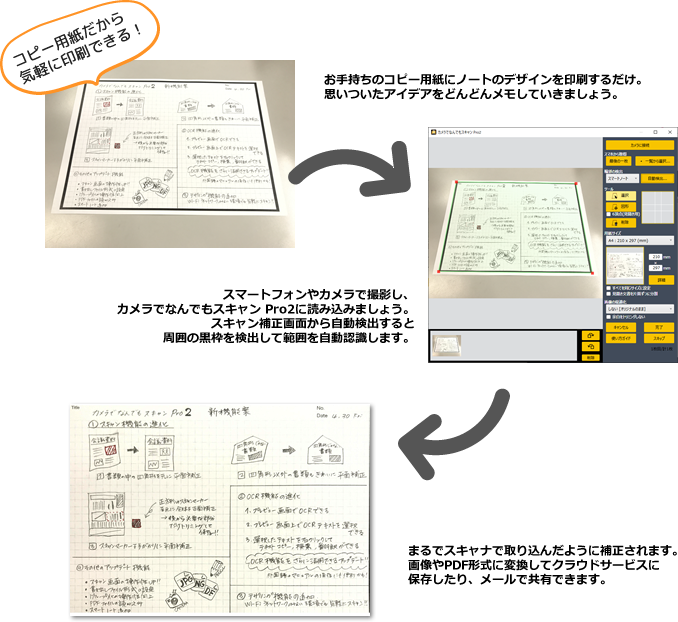 専用ノートデザインを収録。お手持ちのプリンターで印刷して利用できます。市販のスキャン専用ノートのように簡単に取り込むことができます。必要な枚数だけを印刷(もしくはコピー)しておけば、いつでも気軽に利用できます。アイデアスケッチなど思いついたら気兼ねなくメモをして、スキャンしてデジタル保存をしましょう。