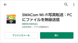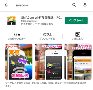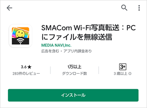 スマートフォンからGoogle playの「SMACom Wi-Fi写真転送」のダウンロードページに移動します。