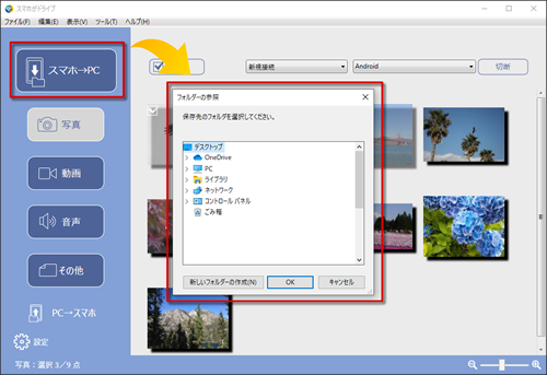 「スマホ→PC」ボタンをクリックし、ダウンロード先を指定し、「OK」をクリックします。