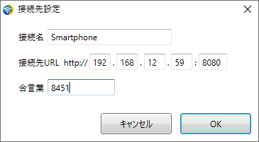 スマートフォンアプリに表示のURLと合言葉、接続名を入力して保存します。