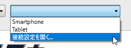 「スマホがドライブ」のツールメニューから「オプション」を選択するか、メイン画面の「デバイスの選択」ドロップダウンリストから「接続設定を開く...」を選びます。