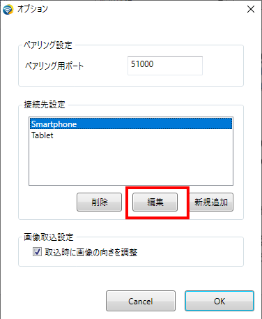 「オプション」画面が表示されます。該当の接続先名を選択し、「編集」ボタンをクリックします。