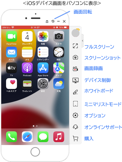 - フルスクリーン:スマホ画面をパソコンのスクリーンに最大表示します