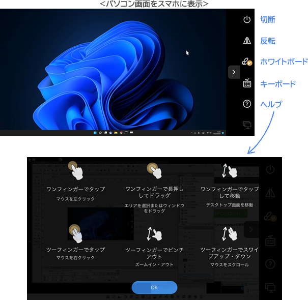 パソコン画面をスマホにミラーリングした際に利用できる機能を紹介します。