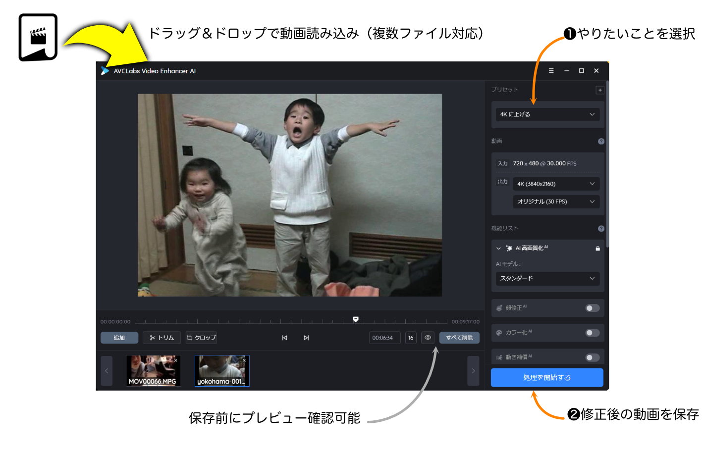 高解像度化の作業も、白黒映像のカラー化作業も、たったの2ステップと操作は簡単です。