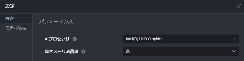AIプロセッサーをCPUとGPUどちらで実行するか選択することができます。(設定できる内容はお使いのマシン環境によって異なります。)