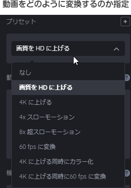解像度を上げる目的だけであれば「画質をHDに上げる」「4Kに上げる」を選びます。