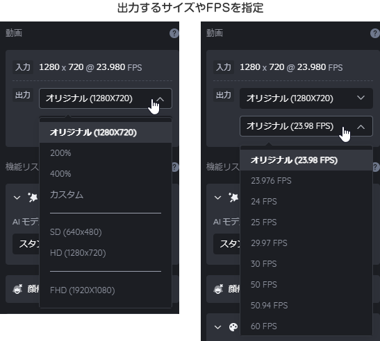 AIによって動画を分析し、被写体に合わせて再描画していくことで、拡大しても高画質な動画を生成しています。手動で