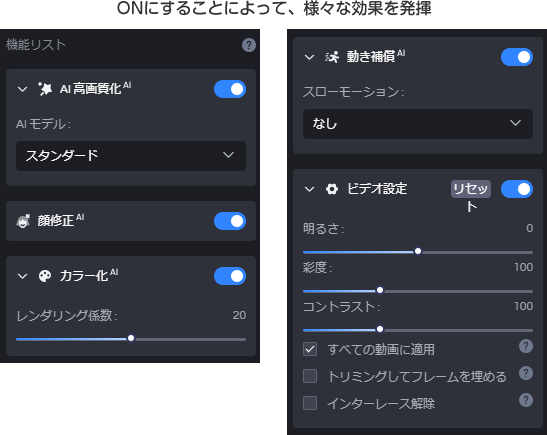 更に、ノイズ除去やインターレース解除、映っている人物の顔を補正する機能など、AIが動画を判定し綺麗に加工します。