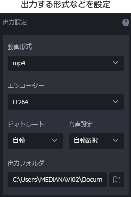 出力する動画のファイル形式や、エンコーダーの種類、ビットレートを指定します。