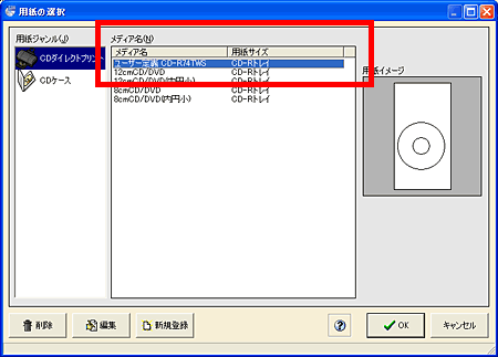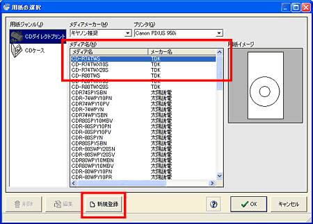 - 用紙の選択画面にて、使用するメディア名を選択した状態で「新規登録」をクリックします。