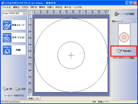 - アップデートが完了したら、「らくちんCDダイレクトプリント for Canon」を起動し、「用紙選択...」ボタンをクリックします。