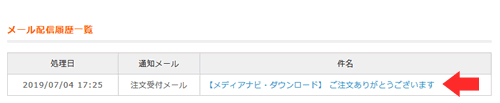 購入履歴一覧表の「詳細」をクリックし、「メール配信履歴」の件名をクリックすると、メールの内容をご確認いただけます。